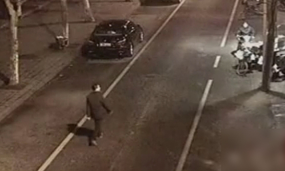 Không có camera giám sát trong ký túc xá này. Cảnh sát đã gỡ bỏ tất cả các camera gần đó vào khoảng 3:30 chiều. Vì Zhang nói rằng anh ta đã kiểm tra thời gian điện thoại sau khi nghi phạm bỏ trốn. Từ đó, cảnh sát tìm thấy nghi phạm đi giữa đường lúc 3:31 sáng. Anh cao từ 1,70m đến 1,75m, gầy và gầy, mặc áo khoác cổ cao và vai. Nghi phạm đang đi giữa đường. Ảnh: CCTV .